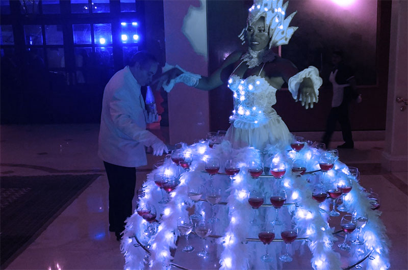 Una hermosa Diva creará un momento muy especial durante el brindis o coctel de tu evento generando gran recordación del público asistente por su originalidad y belleza al portar las copas de vino o champagne en su hermosa falda.